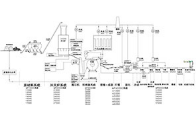 原材料玄武巖、白云石和焦炭,通過鏟車上料,根據(jù)參數(shù)設(shè)置自動輸送到對應(yīng)的原材料大倉。大倉中的原材料根據(jù)中控室設(shè)定的配方,通過自動計(jì)量系統(tǒng)分批自動稱量,然后通過皮帶分批填入沖天爐中。原材料填入沖天爐后,富氧的空氣通過沖天爐風(fēng)口吹入沖天爐,焦炭劇烈燃燒釋放熱量,使?fàn)t內(nèi)最高溫度達(dá)到1500℃以上,玄武巖和白云石逐漸融化,并形成粘稠的熔體。熔體通過沖天爐側(cè)面的虹吸口流出,經(jīng)過調(diào)整好的流道落到離心機(jī)的輥?zhàn)由?,粘稠的熔體通過流道先后落到離心機(jī)高速旋轉(zhuǎn)的四個輥?zhàn)由希趶?qiáng)大的離心力作用下熔體被輥?zhàn)铀Τ?-5微米直徑的熔絲。在離心機(jī)的輥?zhàn)又車袌A形的風(fēng)環(huán),吹離風(fēng)系統(tǒng)強(qiáng)大風(fēng)力和風(fēng)量由風(fēng)環(huán)吹出,將熔絲急速冷卻成固態(tài)的纖維,吹離輥?zhàn)又車?。與此同時通過噴膠系統(tǒng)調(diào)配好的酚醛樹脂、憎水劑、防塵油等由離心機(jī)輥?zhàn)又車膰娮靽姵觯鶆驀姙⒃诶w維絲表面,被離心機(jī)吹離風(fēng)系統(tǒng)吹出的纖維經(jīng)過積棉室落到積棉鼓上,積棉鼓為圓柱狀,其繞軸向旋轉(zhuǎn),側(cè)面有網(wǎng)格,中心由引風(fēng)系統(tǒng)形成負(fù)壓。隨著積棉鼓的旋轉(zhuǎn),纖維不斷地被負(fù)壓吸附在積棉鼓一邊的網(wǎng)格上,形成一次氈。一次氈隨著積棉鼓的旋轉(zhuǎn)到達(dá)另一邊時,網(wǎng)格后面的風(fēng)刀將一次氈吹離鼓面,隨水平皮帶輸送到擺錘,擺錘擺動進(jìn)行鋪氈達(dá)到一定層數(shù)和厚度通過輸送皮帶機(jī)送入打褶機(jī),進(jìn)行加壓提高巖棉板的抗拉強(qiáng)度,然后送至固化爐進(jìn)行固化成型,從固化爐出來的巖棉板進(jìn)行冷卻后送至切割系統(tǒng)進(jìn)行切割,切割后的成品板材經(jīng)碼垛機(jī)碼垛后,送至包裝系統(tǒng)進(jìn)行熱縮包裝,合格的產(chǎn)品,最后經(jīng)由叉車送至庫房進(jìn)行保管。